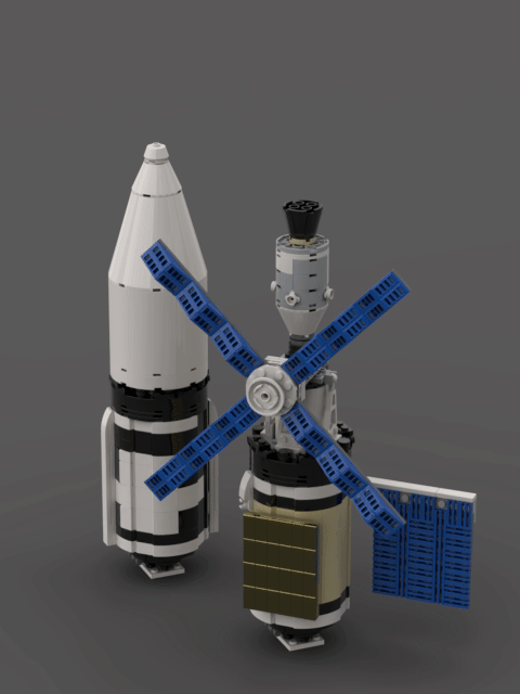2. Skylab in folded position inside of aerodynamic shield and upper stage to be fitted on top of Saturn V.
